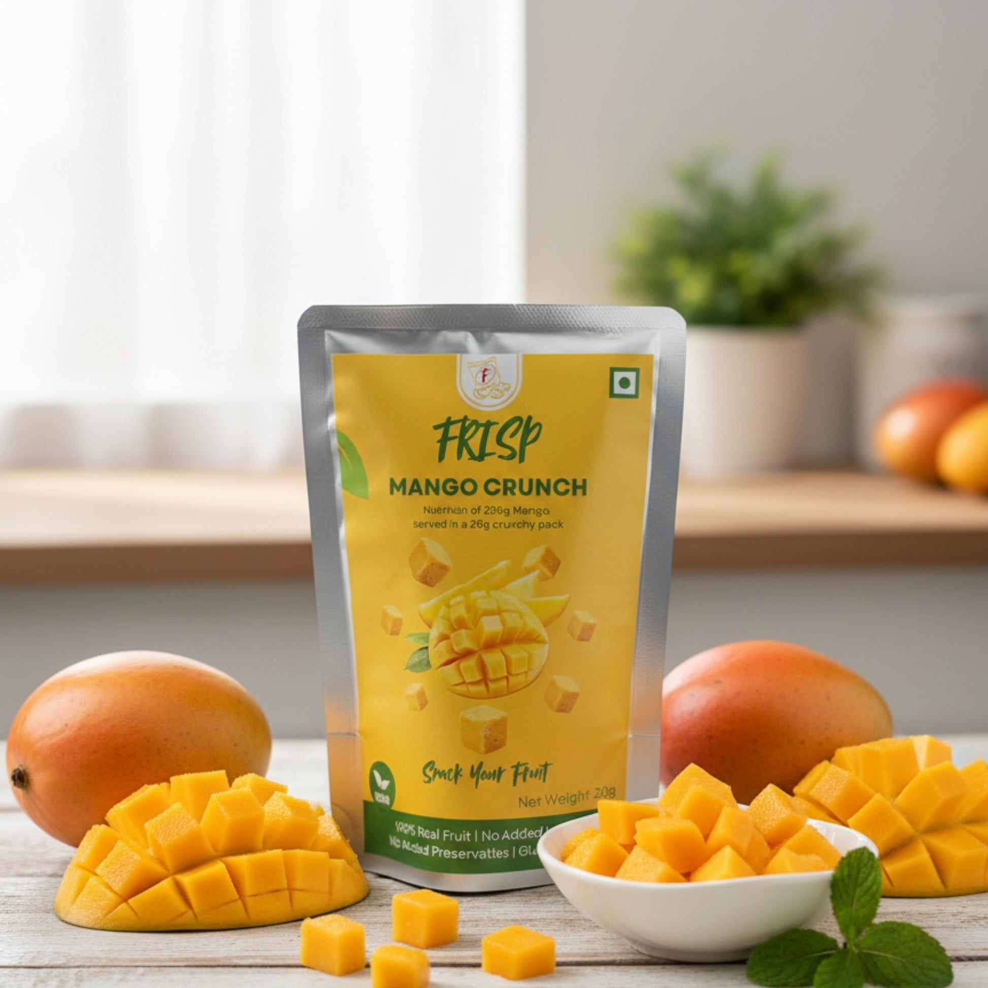 Frisp Mango Crunch is crafted from 100% ripe Alphonso mango pulp, freeze-dried to preserve its natural sweetness, bright color, and nutrition. The result? A light, crunchy, and irresistibly tropical snack you can enjoy all year round.